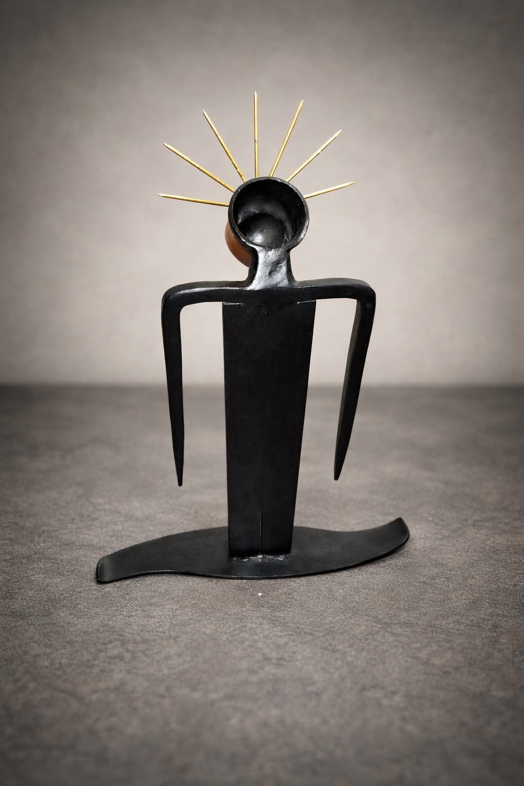 Africano Chamán – Hombre representa la energía vital, la raíz y la conexión con la tierra. Realizado artesanalmente en metal reciclado, combina estructura sólida y expresión simbólica, dando lugar a una pieza potente y equilibrada.