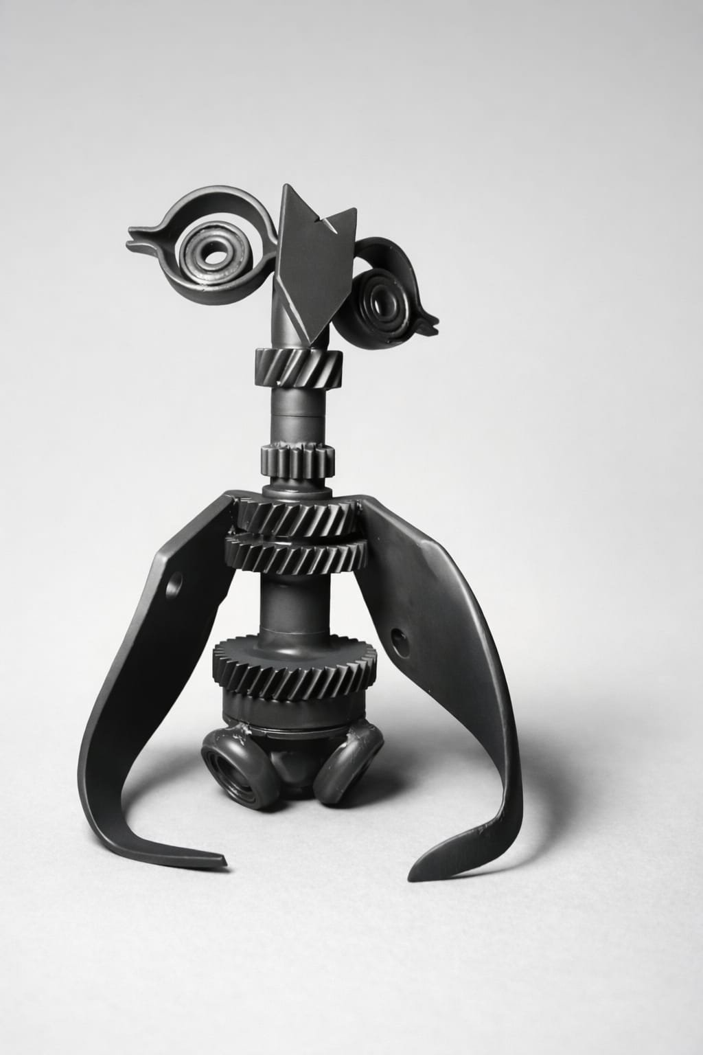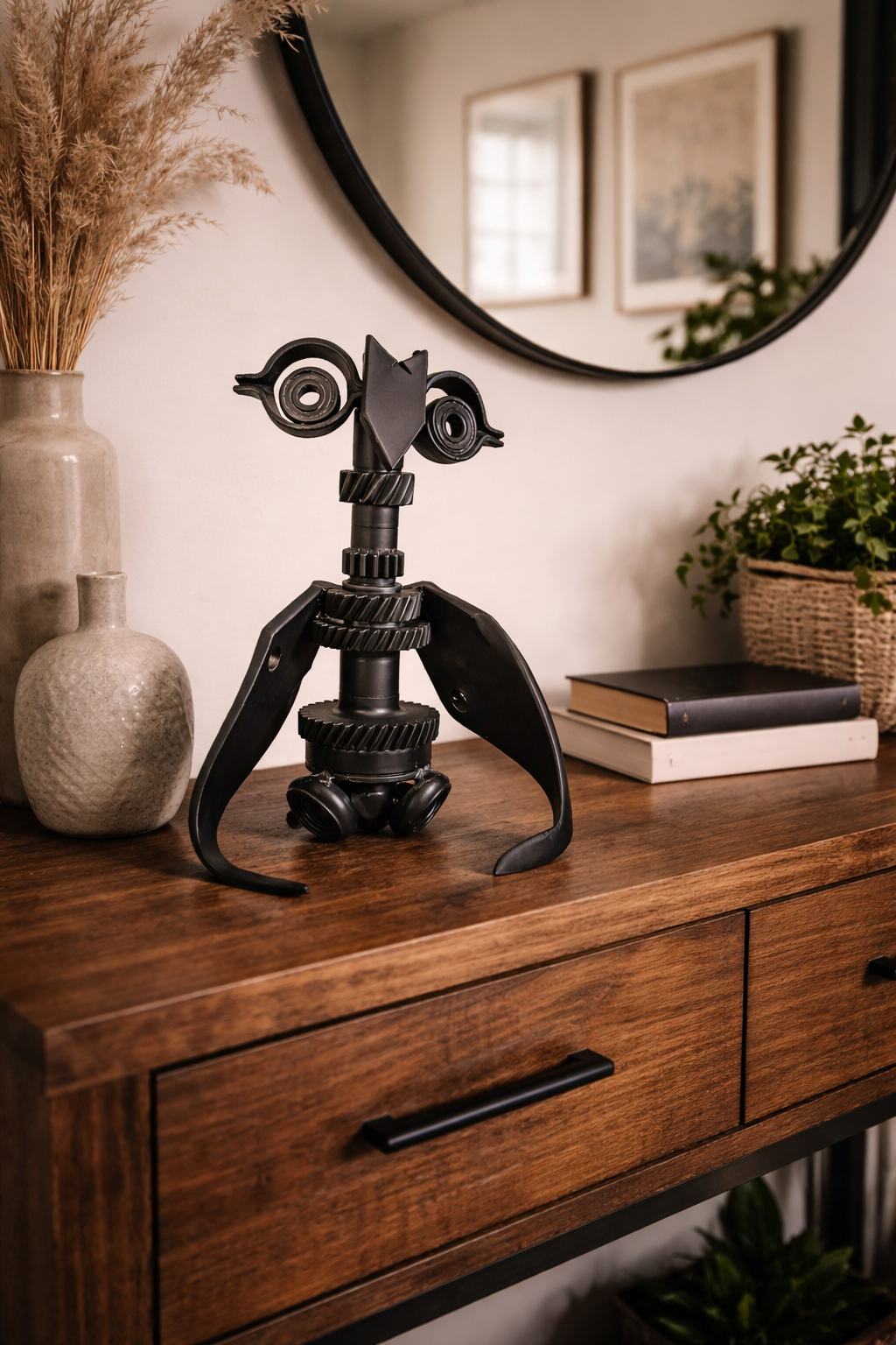 Su estructura está compuesta por engranajes reales, acero trabajado a mano y formas geométricas que evocan un búho moderno. Las alas curvas aportan equilibrio visual, mientras que los rodamientos que forman sus ojos transmiten esa sensación de atención permanente, como si vigilara el ambiente con serenidad.