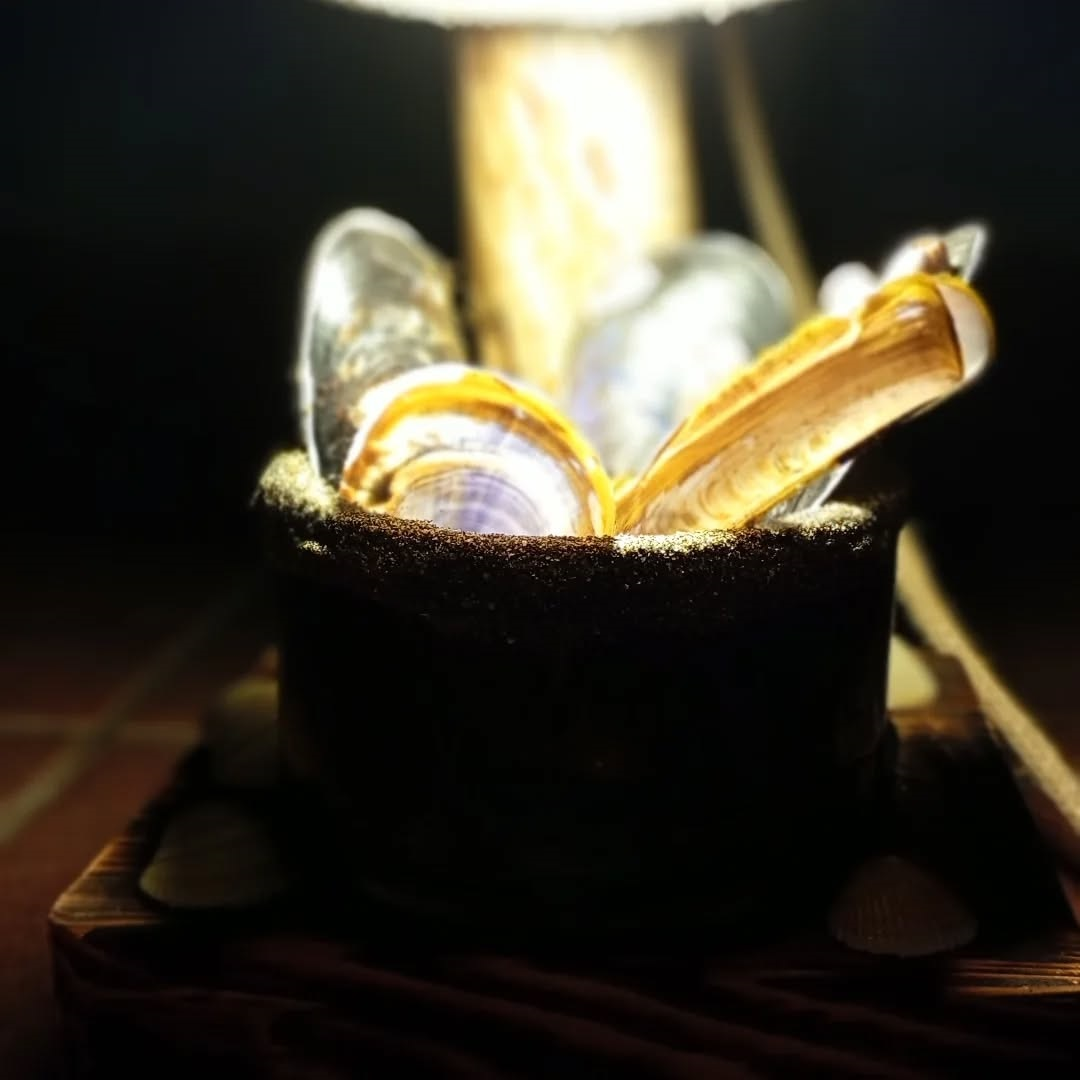 “Origen Atlántico – Cariño” es una lámpara de mesa artesanal elaborada a partir de madera reciclada y materiales recuperados, combinados con elementos naturales de la costa gallega.