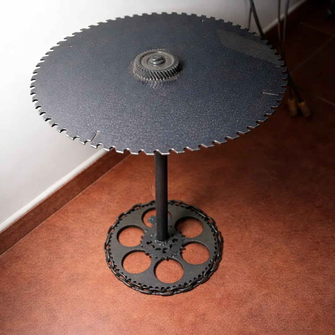Mesa auxiliar de diseño industrial, fabricada artesanalmente a partir de piezas metálicas reutilizadas. La tapa circular está realizada con un disco dentado de acero, intervenido con engranaje central, aportando identidad y presencia visual.